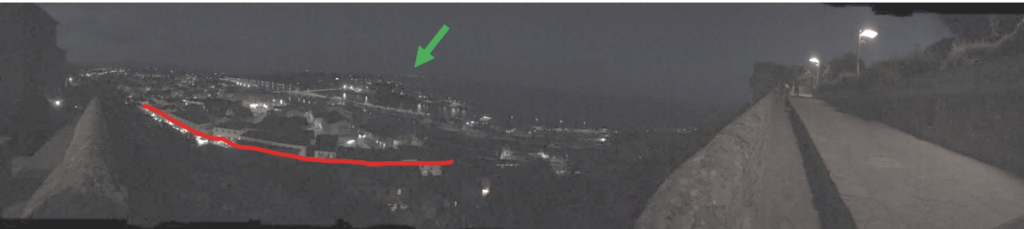 Der rote Strich ist das Hauptgässlein mit den vielen Läden. Der grüne Pfeil zeigt auf die Lichter von Marina di Grosseto.